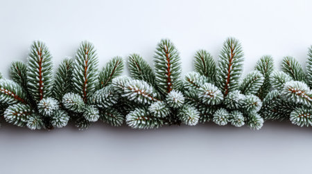 Minimalist Christmas setting with frosted pine branches along top edge of white background, empty space below