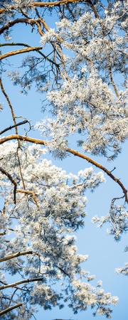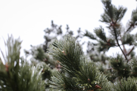 Pine branches in hoarfrost late fall day
