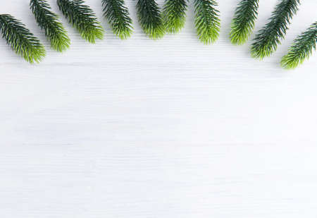 Christmas white wooden background with pine tree branches. Top view with copy space for your text