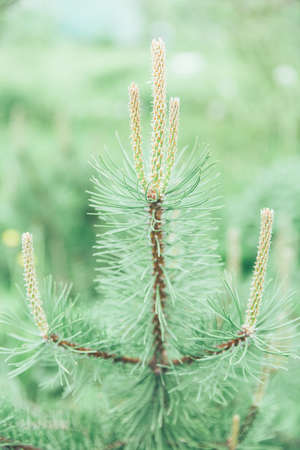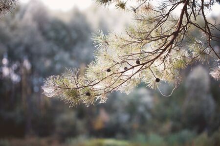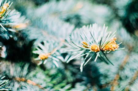 Fresh spring morning colors yellow brown blue needle tree fir branch in a sunny sunset forest park blurry background with free copy space for text. Photo in retro vintage hipster style of processing