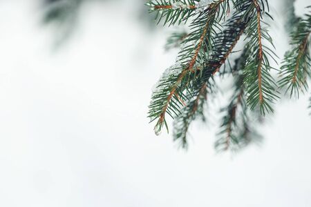 snow covered spruce branch with white backgrounds. Soft focus effect