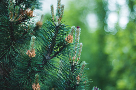 Closeup photo of green needle pine tree. Blurred pine needles in background. Daylight.