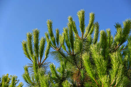 Pine branch against the blue sky. Copy space for text. A message corner.