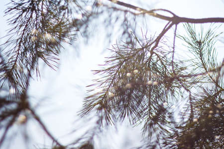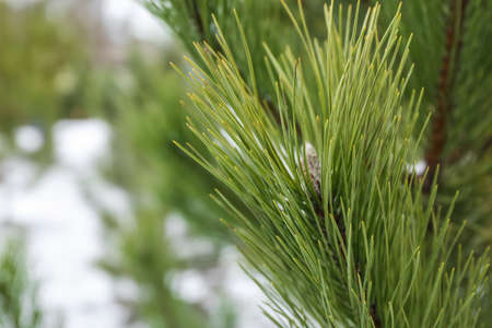 selective focus of white pine branches with needles on blurred background