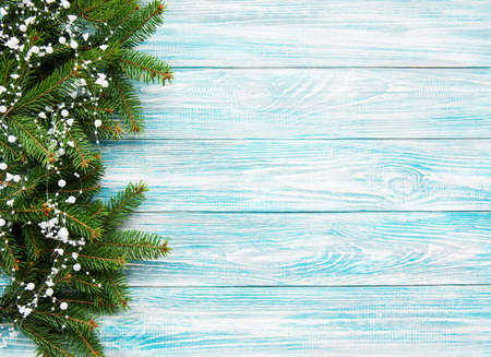 Christmas holiday background - Christmas tree and garland on a old wooden background