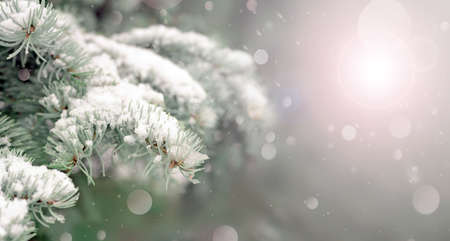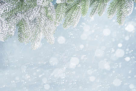 Winter background with frosted pine or spruce twig, christmas greeting card, space for text, natural snow background
