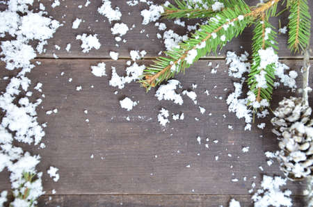 Christmas tree with snow. background for christmas and new year. Christmas tree and cones in the snow on a brown wooden background. copy space. top view
