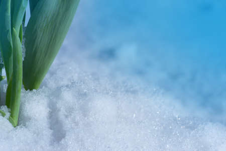 Tulips sprouts with melting snow. Fallen snow a field of tulips