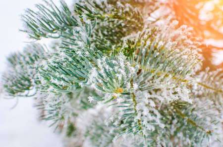 Christmas tree with snow outdoor, frozen branch of spruce with snow, colden winter day.