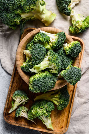 Raw broccoli in a wooden bowl. Gray background. Top view.