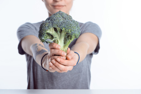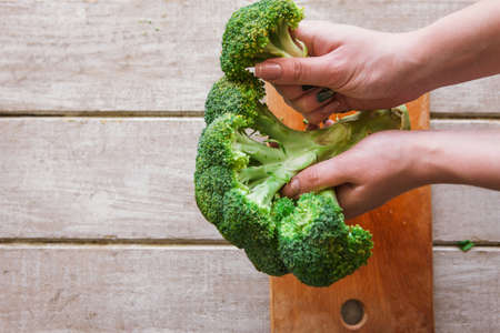 Closeup of woman holding fresh broccoli in hands, selective focus.