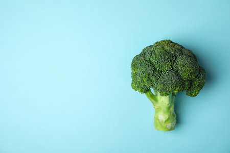 Broccoli on blue background, top view. Healthy food