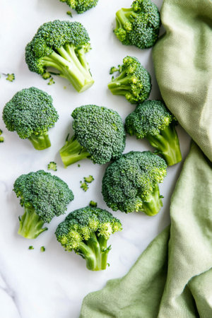 Broccoli florets are artistically scattered on a polished marble surface, complemented by a soft green cloth. The arrangement highlights the freshness and natural beauty of the vegetables.