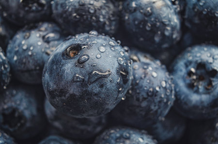 Macro fresh blueberry background. Crystal drops of water on purple blueberry. Selective focus, blur