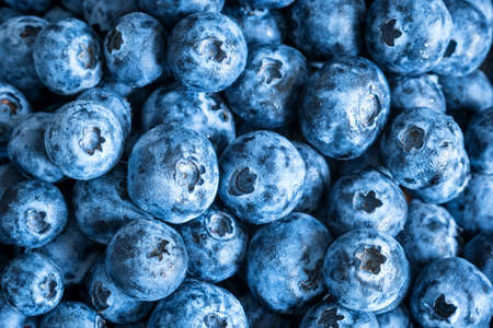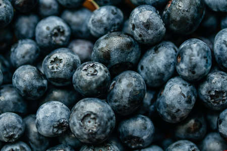 Blueberry background. Ripe, wet and juicy fresh picked blueberries, closeup. Organic Blueberries, macro shot. Vegan sweet food, market.