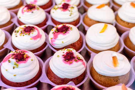 Group of freshly cooked cakes with whipped cream and fruits, displayed for sale at an weekend street market, selective focus