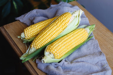 yellow fresh corn on wooden board