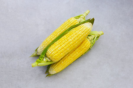 Fresh sweetcorn cobs on the textured grey table, top view