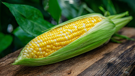 Closeup of ripe corn cobs with lush green leaves, showcasing natural textures