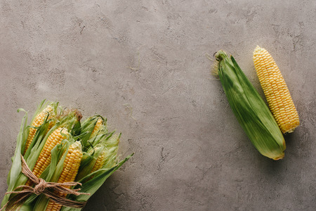 top view of fresh corn cobs tied with rope and one corn apart on grey concrete surface