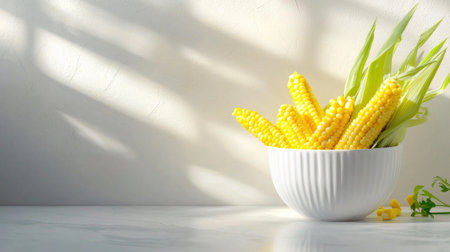 A stunning composition featuring fresh yellow corn cobs arranged in a white bowl on a marble surface, illuminated by soft natural light.