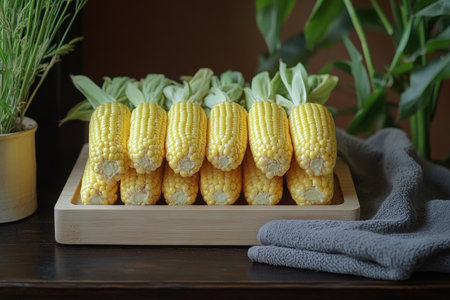 Bright yellow corn ears with green husks arranged neatly on a rustic wooden board, accompanied by a soft blue cloth napkin, ideal for a summer feast or rustic kitchen setting.