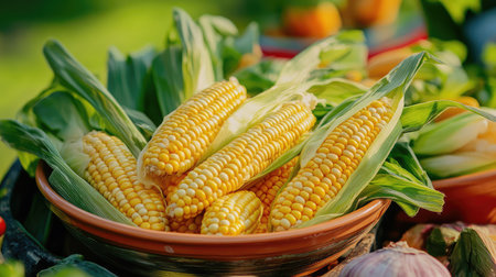 A beautiful arrangement of freshly harvested corn in a rustic bowl, surrounded by vibrant vegetables and lush greenery, showcasing organic farming.