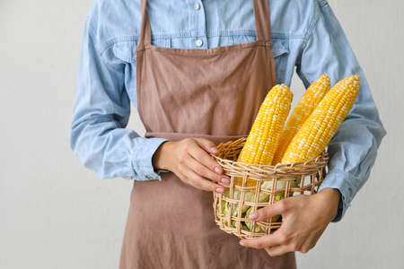 Woman holding basket with fresh corn cobs on light background