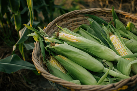 Wicker basket overflowing with freshly picked corn on the cob, suggesting a bountiful harvest
