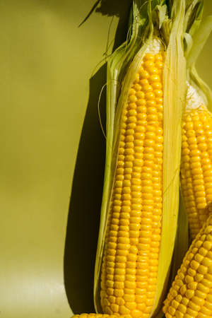 Fresh yellow corn cobs on green background. Fresh vegetables.