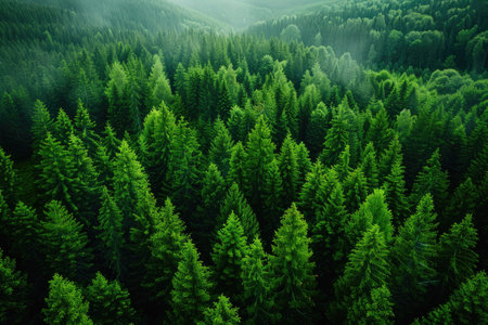 An overhead view reveals a dense forest canopy composed of numerous tall evergreen trees. The scene showcases a variety of green hues, with textures of needles and branches. The composition is framed by subdued lighting. The image suits commercial and editorial applications to depict nature or environment.