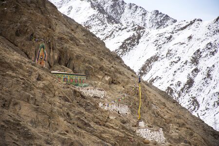 Beautiful landscape view of the ancient Gompa located on a hillock at Shey Palace Monastery, background with sky, clouds in Ladakh, Jammu and Kashmir,India.