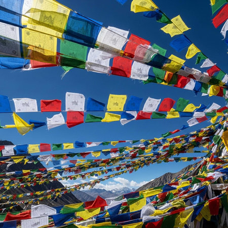 A colorful Buddhist prayer flag flutters in the crisp mountain air, a vibrant symbol of hope and spirituality against the majestic backdrop of snow-capped Himalayan peaks.