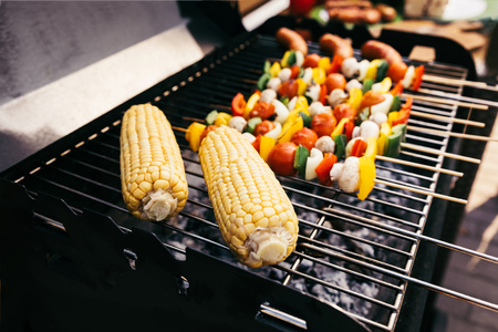 Corn cobs and vegetables on skewers cooked outdoors on grill
