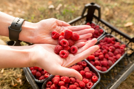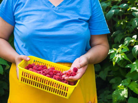 Womans hands full with raspberry berries. Red raspberries in plastic container box in garden, close-up view. Freshly harvest. Healthy eating, dieting fruits