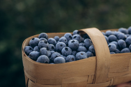 Fresh blueberries in wooden baskets at farm warehouse farm to table concept with lush greenery