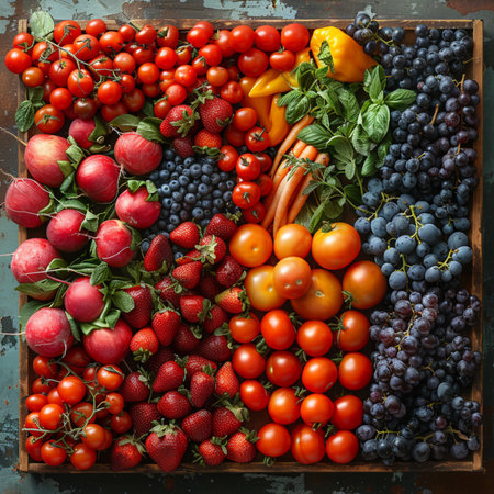 Explore a vibrant collection of fresh fruits and vegetables artfully arranged on a grey table surface. Ideal for promoting healthy eating and organic produce.