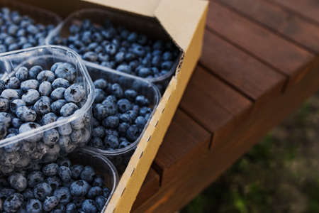 Blueberries in clear plastic tray. Freshly harvested blueberries on the farmyard, food concept.