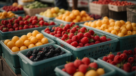 Fruits and vegetables at a farmers market. Fresh organic berries.