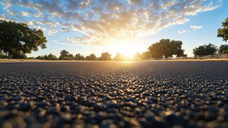 A low-angle shot of an asphalt road stretching towards the horizon, illuminated by the golden light of sunrise or sunset. The focus on the road's texture against a blurred background symbolizes travel, the future, and the journey ahead.