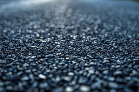 Low angle view of a newly paved asphalt road, focusing on the texture and small stones, with a blurred background. Suitable for themes related to travel, road construction, and transportation.