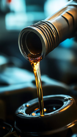 A close-up image capturing the moment engine oil is poured from a bottle into an engine component, highlighting industrial processes in a workshop setting.