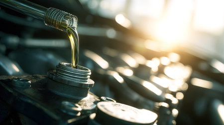 Warm morning light baths an open engine bay as viscous oil flows smoothly from a container, symbolizing fresh maintenance and new beginnings.