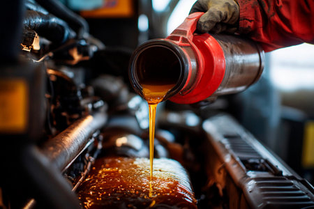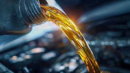 A close-up view of engine oil being poured into a car engine, showcasing essential maintenance for vehicles. The scene highlights the importance of lubricants in automotive performance.