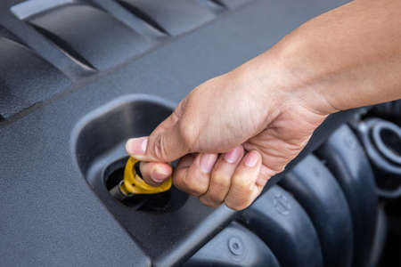 Home service car concept : A man check level of engine oil and see the stains from use basic maintenance of car