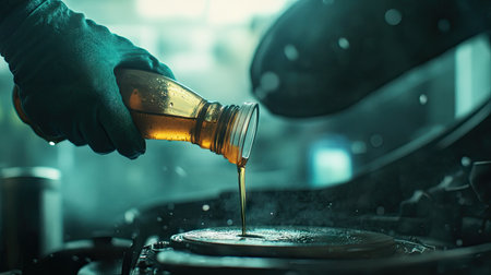 A detailed focus on a mechanic's hand carefully filling a shiny, amber-colored fluid into a vehicle?s engine, with a softly blurred workshop environment highlighting ongo