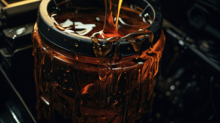 Beautiful close-up of engine oil flowing in warm sunset light, capturing the rich amber color and reflective qualities of the liquid for automotive themes.