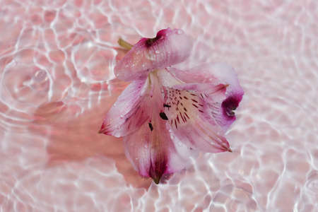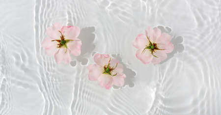 Greeting card with beautiful rose petals macro with drop floating on surface of the water close up. It can be used as background. Flat lay, top view, copy space concept.