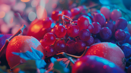 A vibrant display of fresh grapes and apples with dramatic lighting and soft focus, creating a rich and colorful composition.