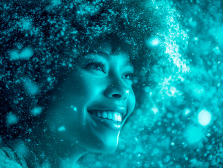 A cheerful young girl basks in warm, radiant illumination, with shimmering specks floating around her, creating a magical and uplifting atmosphere.